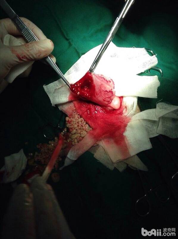 在发生尿道结石的犬中,公犬主要表现为排尿困难、尿频,排尿时表现努责、呻吟等,有时发现血尿,早期还能排出少量的尿液,完全堵塞时不能排出尿液,有的病例包皮处有细沙状的结石,部分患犬出现腹胀,触摸时可发现膀胱充盈、膨大。母犬表现为尿频、尿液混浊、带有纤维素性或黏性絮状物,或尿液中带有血丝,严重时发现血尿,有的病犬尿液中含有小颗粒或细砂样结石。