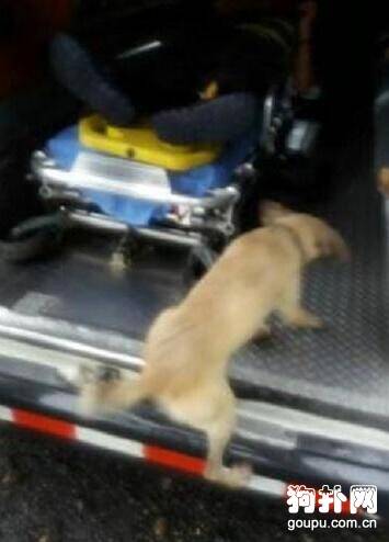 当时的天还在下雨,可狗狗一直守护在自己主人身边不愿离开,还在不断的舔自己的主人。当救护人员把男子抬上救护车的时候,小黄狗二话不说也跟着跳了上去。