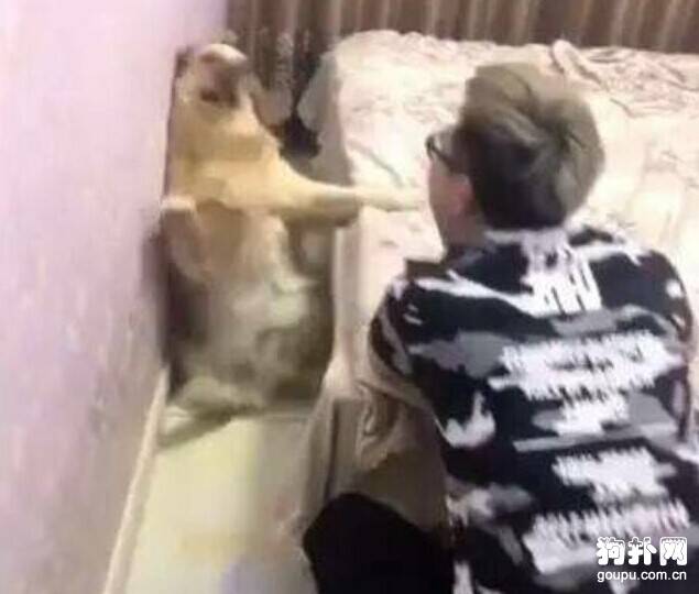 咦?主人终于抬起头了。狗狗看到主人的脸后,吓得直往后倒,前腿一直蹬,可以看得出狗狗被吓得有多严重了,真是小可怜。